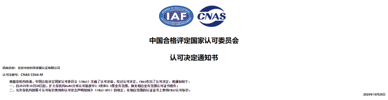 2025年10月28日,北京中經(jīng)科環(huán)質(zhì)量認(rèn)證有限公司(ZJQC)順利通過了CNAS能源管理體系化工和建筑材料兩中類的文件評審和現(xiàn)場見證,目前已獲得鋼鐵、有色金屬、化工、建筑材料、機(jī)械制造、交通運輸、公共機(jī)構(gòu)及服務(wù)和其他等八個領(lǐng)域的CNAS認(rèn)可資格。多年來公司在能源管理體系認(rèn)證方面積極做好專業(yè)儲備,憑借不斷增強(qiáng)的專業(yè)技術(shù)能力拓展認(rèn)證業(yè)務(wù),持續(xù)滿足廣大認(rèn)證客戶的需求。
